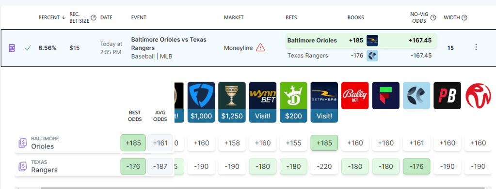This pick is purely based on profitable edge. When I see a 6.56% profitable edge on the no-vig odds, my eyes light up. The books are clearly favoring Texas today. But this is baseball we’re talking about, where a lead can evaporate with a bloop and a blast. I’ll take the upstart Orioles to win at +185 with this big edge, even against a much-improved Rangers squad.