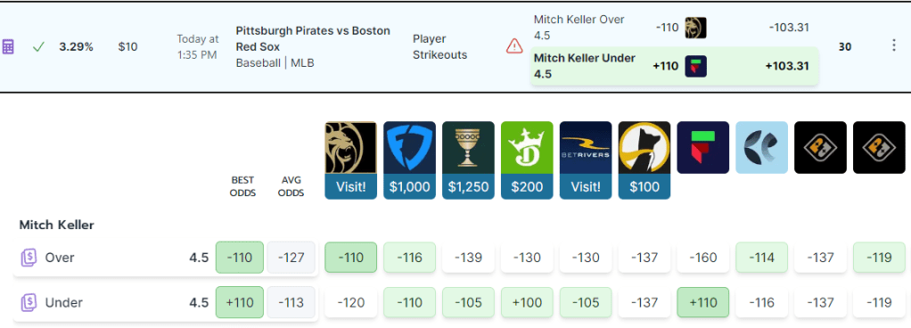 Lastly, let’s grab one more pitcher K prop with Mitch Keller u4.5 K. Books are talking out of both sides of their mouths by juicing the over, but also offering minus odds for the under. They aren’t super convinced he will get to 5 strikeouts. So let’s take the +110 odds on offer by Fliff and call their bluff.