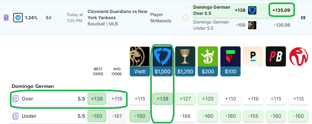 We’re staying in the Bronx for the next pick. German to go over 5.5 strikeouts at +138 beats its positive expected value of +135. It’s also 19 cents better than the market average. Statcast also backs this up as German is in the 84th percentile in K%. He’s only failed to reach this number once which ironically was against the Guardians. He had zero strikeouts in that game, a dubious feat which I don’t think repeats itself.