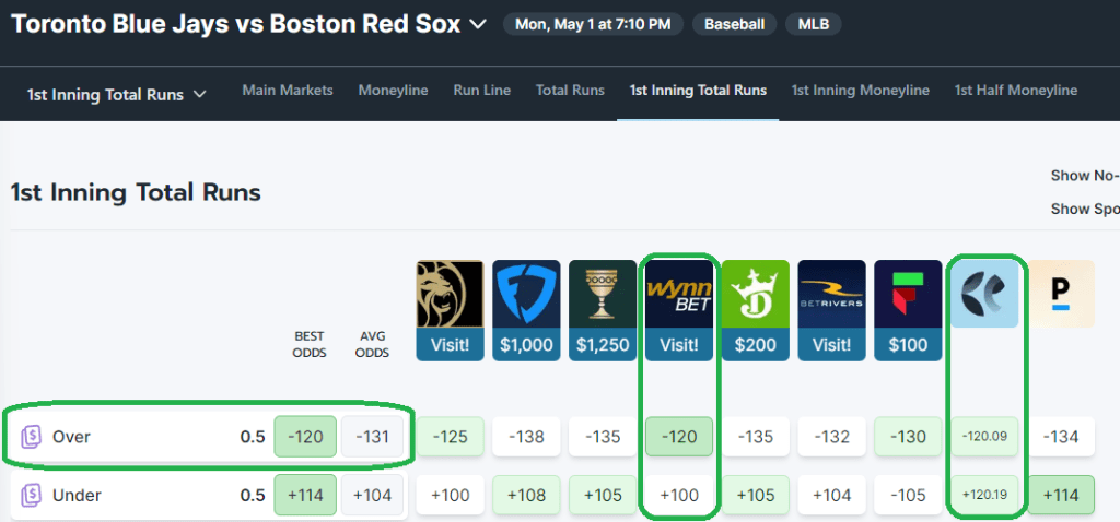 Let’s finish with a fun YRFI bet in Boston. It’s a bit juiced at -120 but the price at Wynn at least equals the fair odds and is 11 cents better than the rest of the market.
